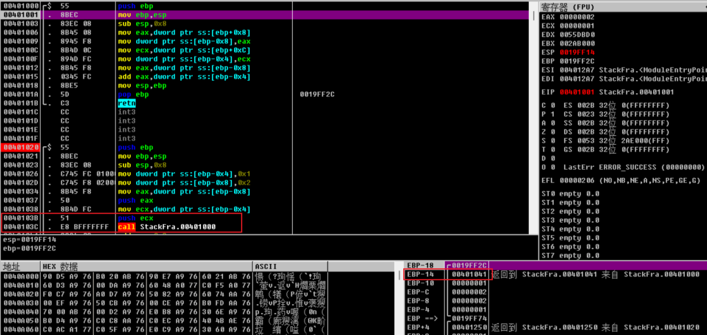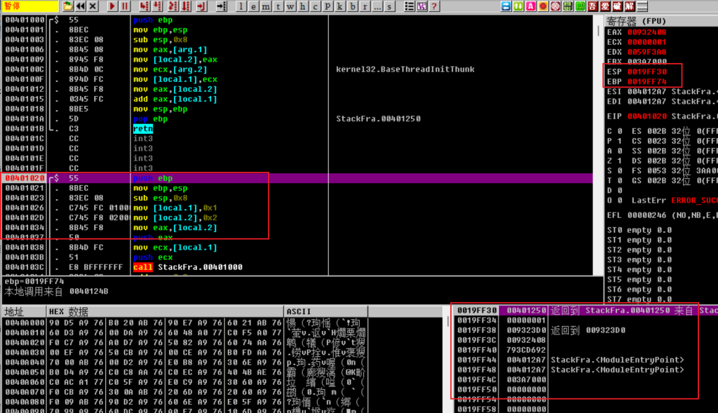 这里有一个点需要注意的就是参数入栈的顺序与C语言源码当中的参数顺序恰好相反(函数参数的逆行存储),源码是add(a,b),这里的push是先将参数2入栈,执行汇编指令后栈内情况如图。