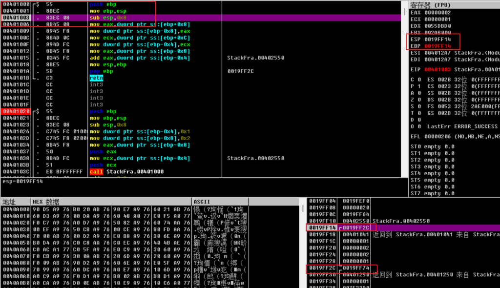 接着将add()函数开始执行时备份到栈中的ebp的值恢复为原来的19FF2C,此时的栈和寄存器的情况如下
