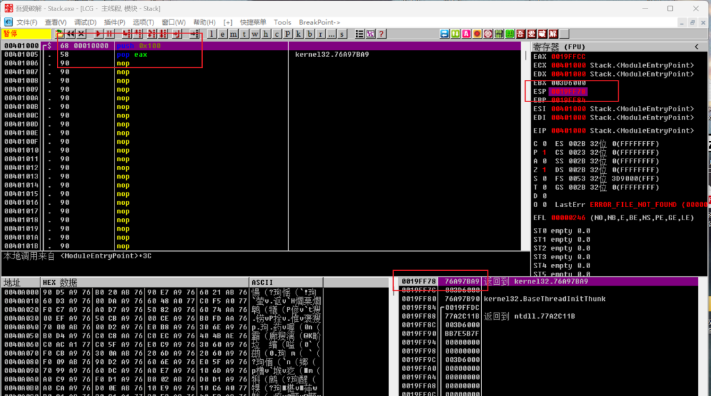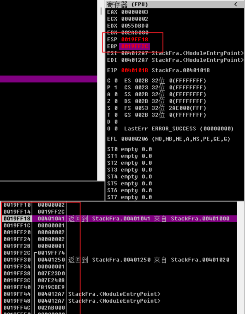 右上记录了初始情况下栈顶指针ESP的值,为0019FF78,右下图则是栈中的情况。