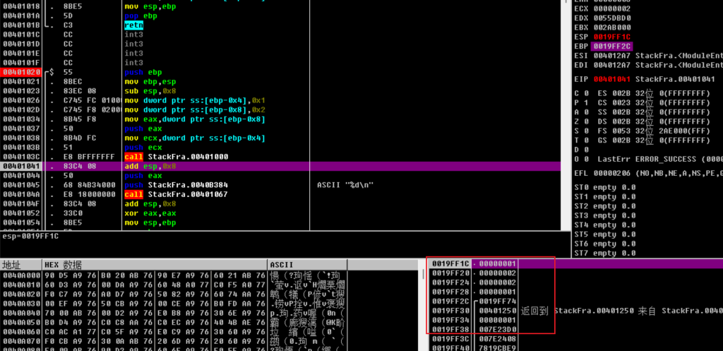其中esp的值指向的地址存储了另外一个地址,就是call命令执行时CPU存储到栈中的返回地址。接着retn就回到main()函数的指令处。此时调用栈就返回到调用add()函数时的状态了。