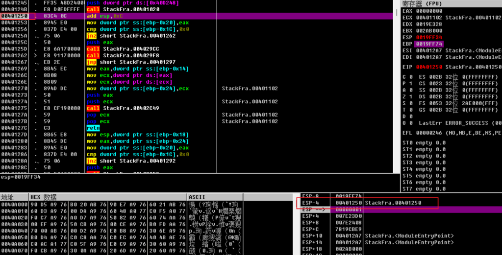 然后再和add()函数中删除栈帧一样的操作,我们执行完retn之后可以看到也返回到地址401250处