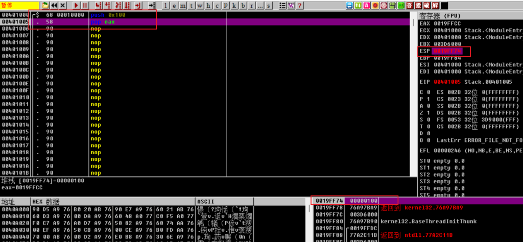 当我们再执行下一条汇编指令pop eax,就会恢复初始的栈的状态,数据0x100被弹出栈,并且ESP的值加上四个字节。