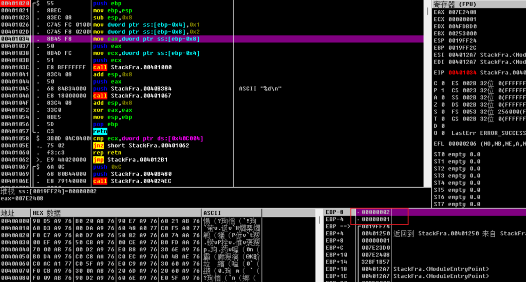 这里的指令也很好理解,需要注意的是,eax寄存器在算术运算中存储输入输出数据,函数的返回值通常也都存储再eax寄存器。执行这两句汇编指令的过程中,栈内的情况并没有变化。