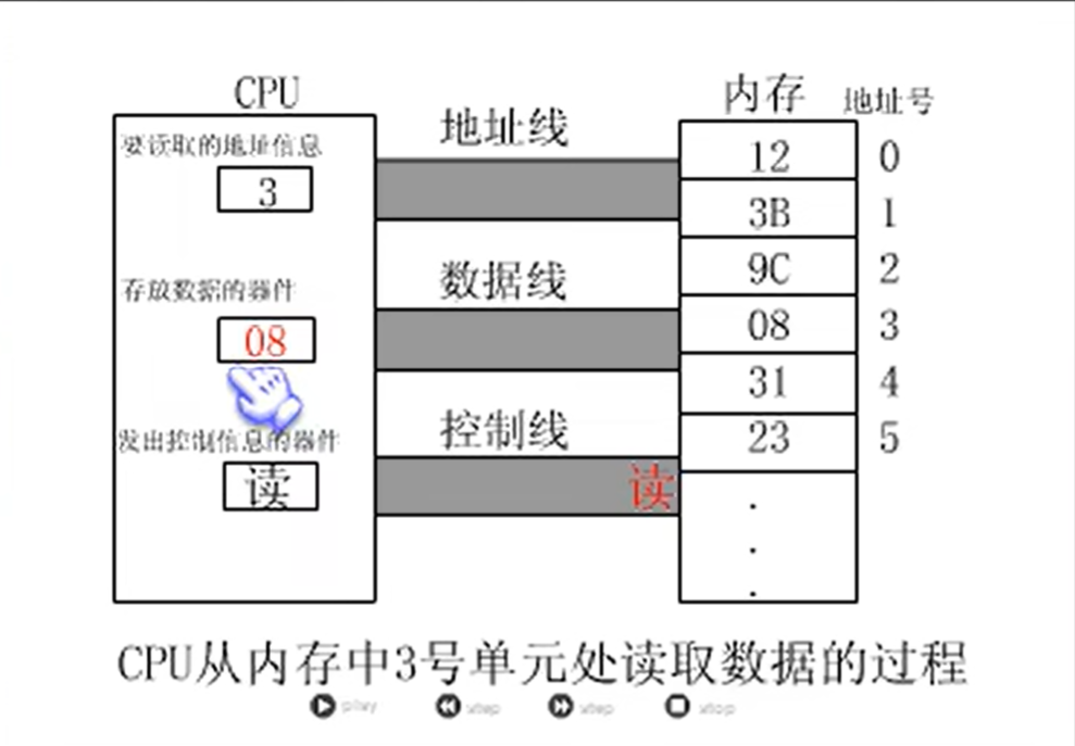 一开始,CPU通过地址线向内存传输要读取的地址信息,图上是3,并通过控制线发出控制信息,是要读取数据,然后从内存中读到08这个数据,通过数据线写入CPU中存放。