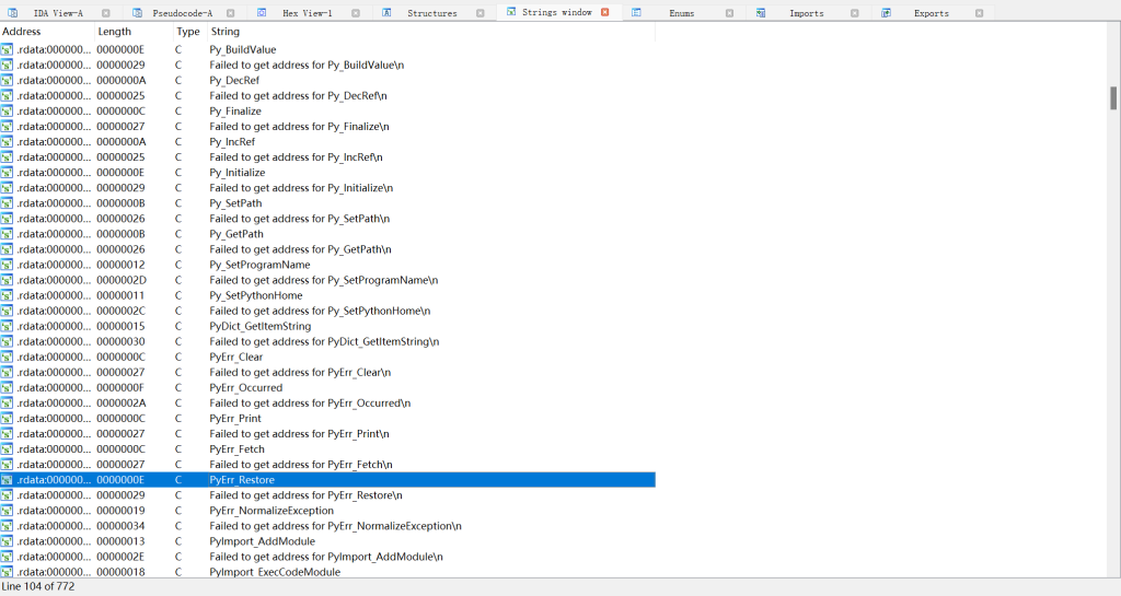 用IDA打开给的PZthon.exe文件,没什么关键函数,直接 shift + F12看Strings Window,发现字符串数据非常多,没什么特别的字符串,要说特别的就下面这几个