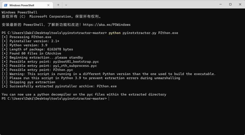 所以按照Writeup,我们要做的,就是依据.exe文件获得它的python源代码吧,毕竟flag的线索大概率在源代码里,利用到解包工具pyinstxtractor,又是第一次接触,不过安装使用都不难,Writeup里面给了下载链接,直接解包