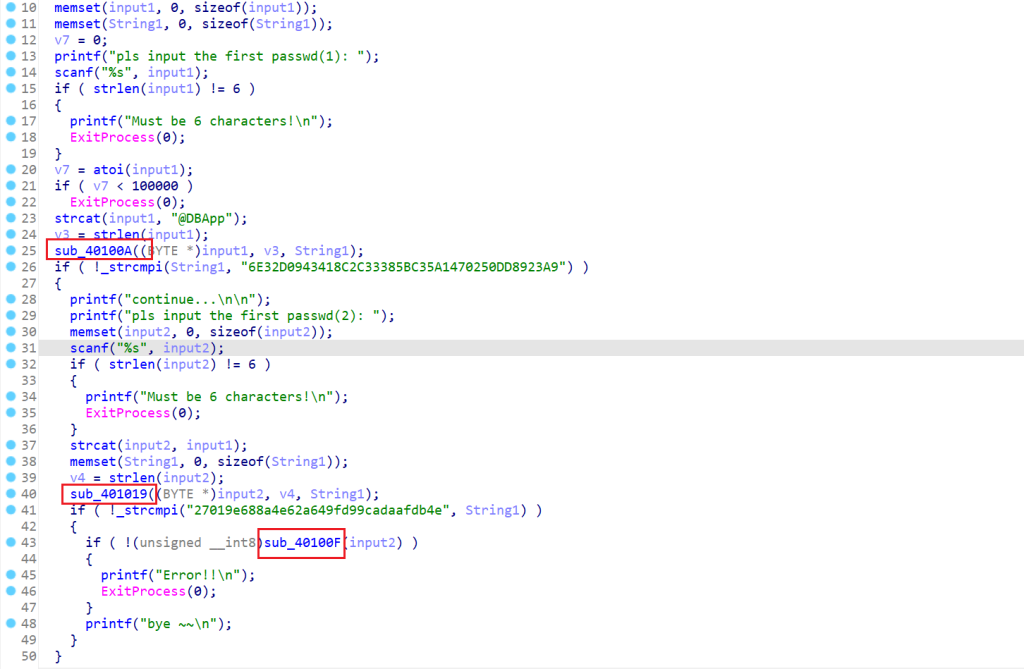 第二部分密码的长度也为6,但没有数字方面的要求。然后会将123321@DBApp拼接在第二次输入的后面,然后被sub_401019函数处理,点进去看看。