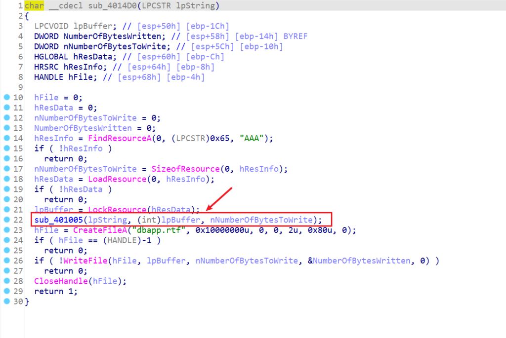 LockResource接收要访问的资源的句柄,如果加载的资源可用,则返回值是指向资源第一个字节的指针;否则为 NULL。然后函数sub_401005接收了主函数里面的拼接完后的总密码,AAA文件第一个字节的指针,和该指针的大小。然后生成dbapp.rtf,我们再点进去看看这个sub_401005函数。