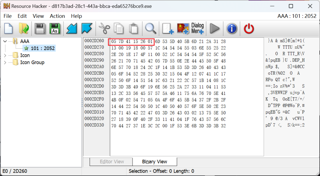 所以文件头前六个就是{\rtf1。但是还有个疑问,AAA文件在哪里呢?这里也是学到了一个新工具Resource Hacker,直接把该可执行程序拖进去,如图