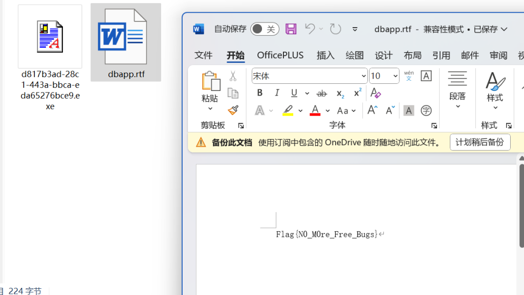 然后再打开可执行程序,输入两个密码,会在它所在的文件夹生成一个dbapp.rtf文件,就是在代码中的CreateFileA()函数的实现,如图